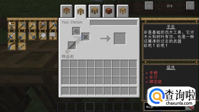 这样,我们终于得到了想要的部件。制作好手柄、斧刃、绑定结部件后,再次回到我们的工具装配台,打开手斧界面,依次放入各个部件,就能做好一把手斧。