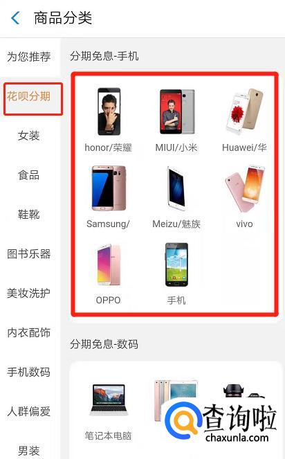在下方的选项中,选择“分期商品”。