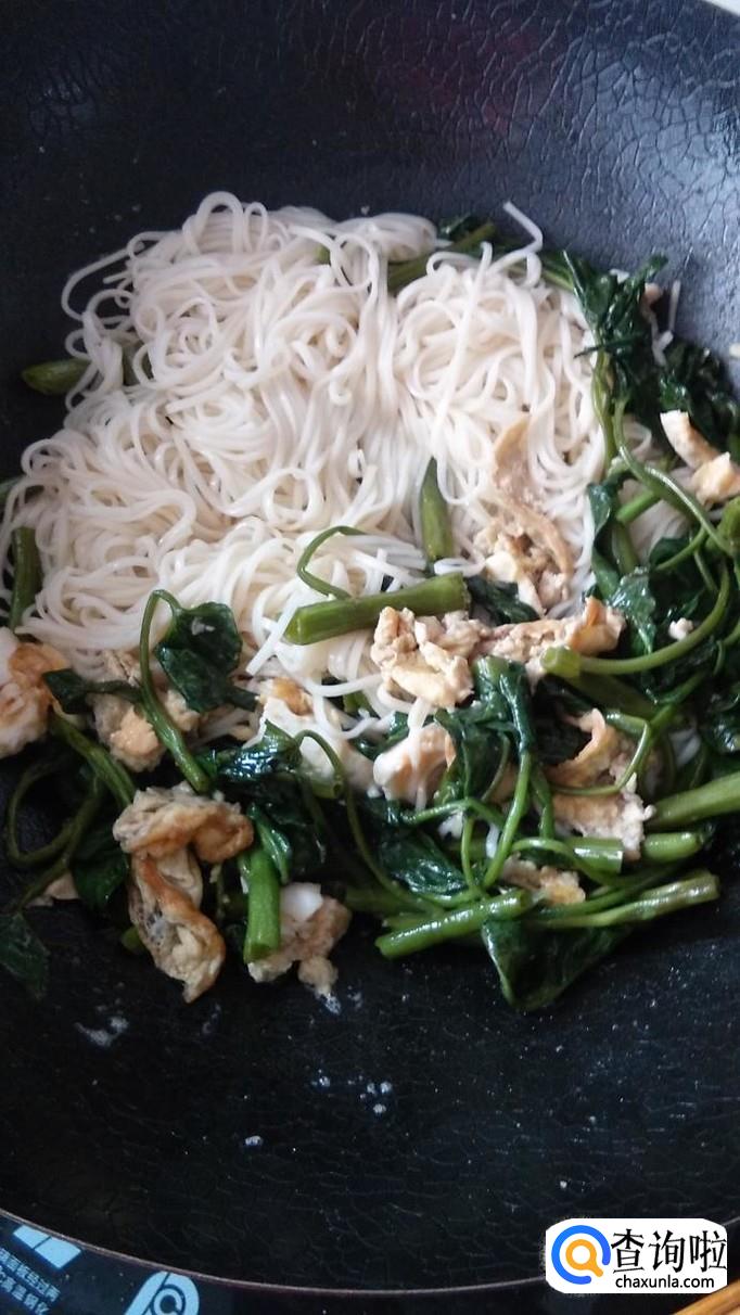 烧热锅底,放油,倒入鸡蛋,再依次放入时蔬,面条,小火进行翻炒。