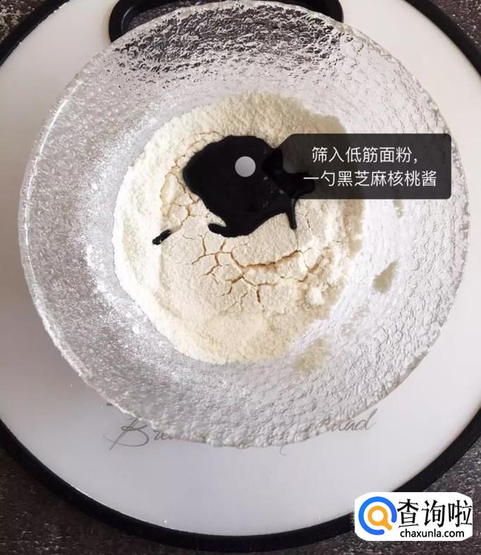 接着筛入低筋面粉并加入一勺的黑芝麻核桃酱,如下图所示。