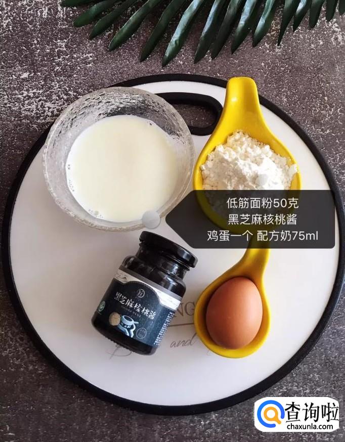 首先准备好所有要用到的食材,如下图所示。小贴士:低筋面粉50克,黑芝麻核桃酱一勺,鸡蛋一个,配方奶75ml。