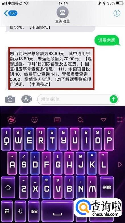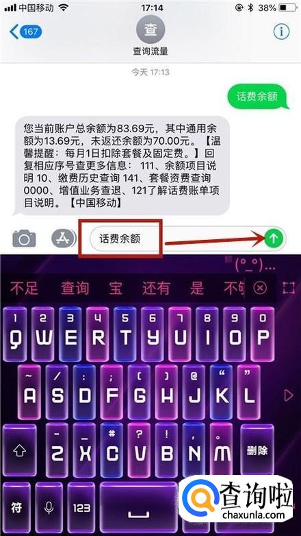 然后输入话费余额并点击发送键,如下图所示。