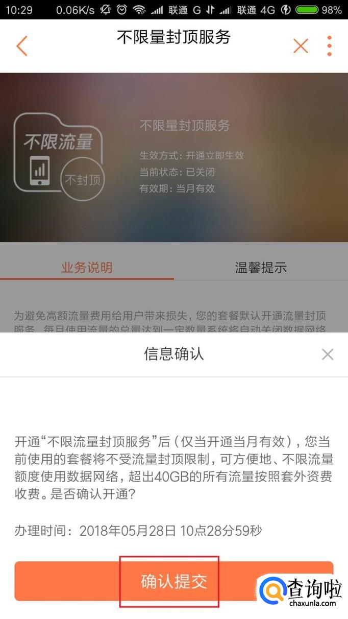 最后,在页面底部弹出的对话框中,点击“确认提交”按钮,即可开通不限流量封顶服务。