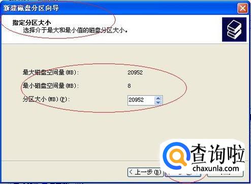 唤出"指定分区大小"选项界面,如图所示。点击分区大小文本框右侧上下箭头,设置扩展磁盘分区大小。
