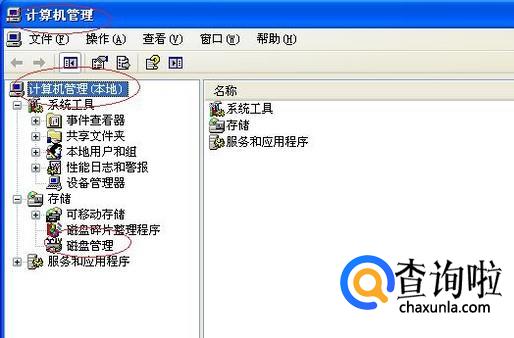 如图所示,唤出"计算机管理"程序窗口。选择"存储→磁盘管理"项,下步将进行系统分盘、分区的操作。