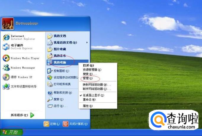 启动Windows XP操作系统,如图所示。唤出任务栏开始菜单,鼠标右击"我的电脑"图标选择"管理"项。
