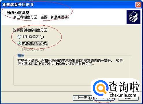 如图所示,弹出"新建磁盘分区向导"对话框。勾选"选择分区类型→扩展磁盘分区"单选框,设置完成点击"下一步"按钮。