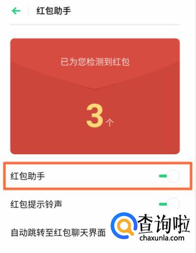 点击【红包助手】右边的按钮开启,还可以选择是否开启红包提示铃声。这样在浏览其他页面立刻就有微信红包特殊提醒,点击就能直接进入页面点击红包。