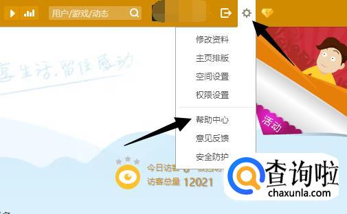 在QQ空间页面的右上角找到设置的图标,然后点击下方一列的【帮助中心】,如图。
