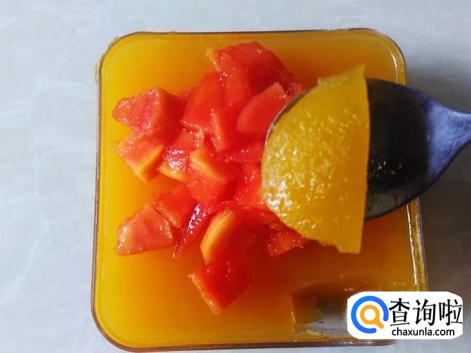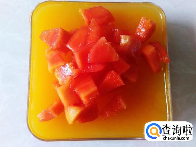 2个小时左右,果汁凝结成果冻了,然后拿出来把木瓜丁铺在上面就可以食用了。