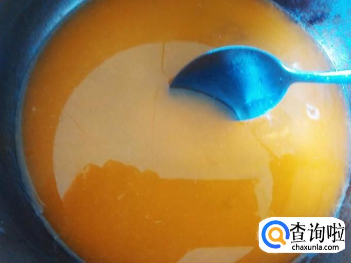 把果汁倒进锅里,用小火煮,一边煮一边用勺子搅拌,煮沸后用勺子搅拌到吉利丁融化完就可以了。