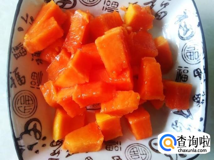 木瓜去皮去籽,然后把适量的果肉切成果丁放到冰箱。