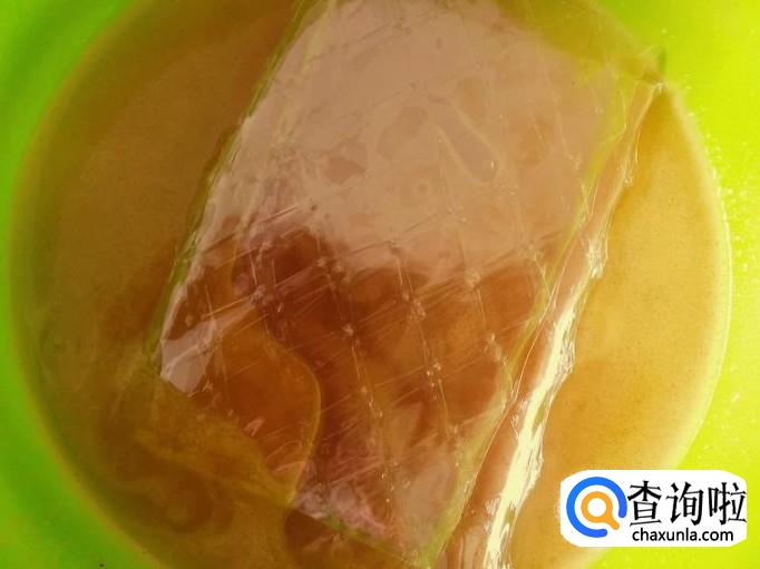 把3片吉利丁片剪成2段,放到桔子汁里泡软。