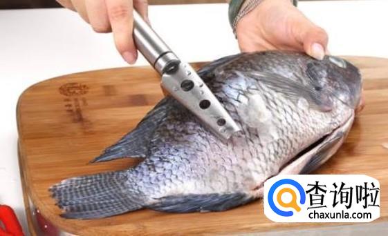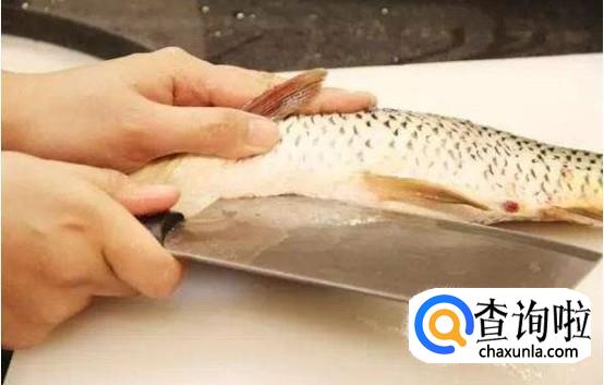 用刀把鱼拍晕,然后左手握住鱼头,右手持刀刮去鱼鳞。刮鱼鳞时一定要逆着鱼鳞刮除。