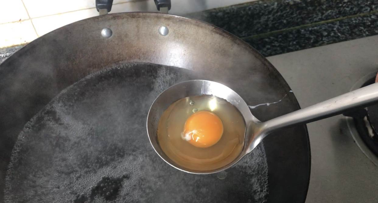 还有个方法适合没有不粘锅,对自己煮荷包蛋没信心的吃货。这方法煮出来的蛋,是最完整的。只要勺里记得放热水,基本不会失败。