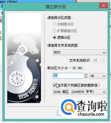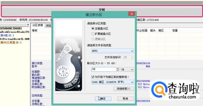 在出现的界面里,选择分区类型为“主磁盘分区”,我们的系统就是安装在主磁盘分区的,也就是所说的系统盘。然后划分主磁盘分区的大小(如果整个固态硬盘都作为系统盘,就不用划分了),还要在下面在“对齐到下列扇区数的整数倍”前打上对号,这就是所说的4K对齐。然后点下面的“确定”。