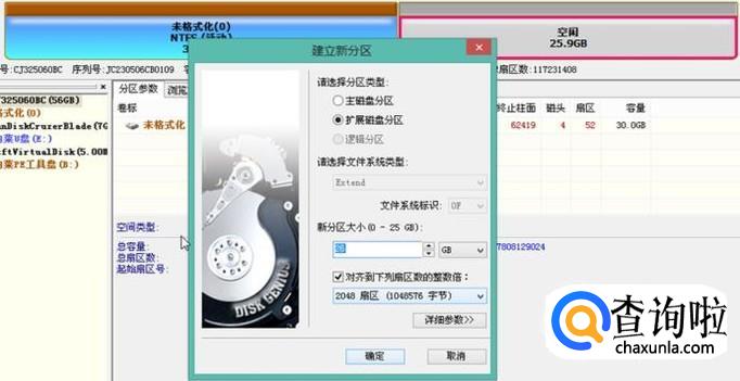 再把剩下的空间先建立扩展分区再建立逻辑分区,方法和建立系统分区一样。