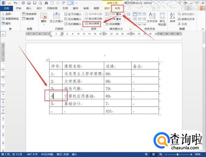 把光标放在准备拆分位置的下一行,点击“布局”选项卡下“拆分表格”。