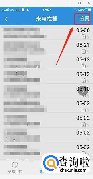 这时会看到你手机上所有的电话拦截记录,点击右上角“设置”