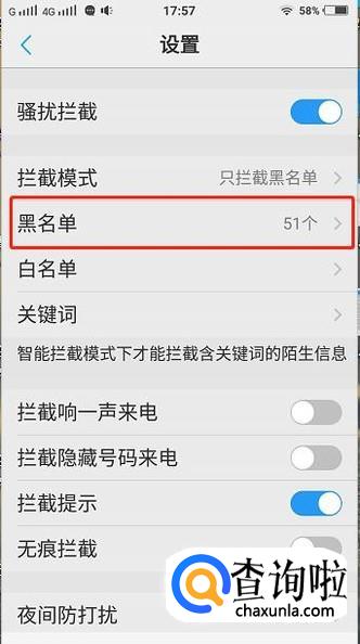 打开“设置”后,会看到一个“黑名单”选项,点击进入: