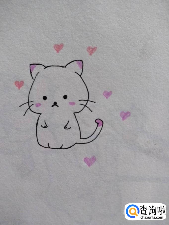最后,再用一些你喜欢的颜色的彩铅在小猫周围画一些可爱的桃心。