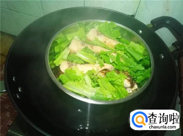 然后把切好的油麦菜均匀铺在鱼块中间,盖上锅盖焖一分钟。