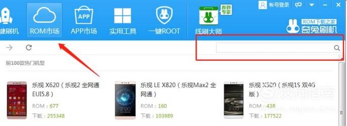 连接成功后,我们进入“rom市场”然后在搜索框内输入“vivox20”手机型号进行查找。