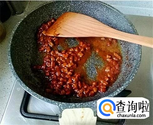 一点肉末放进热油里面炒制,别忘记加上点生姜末和葱末,直到肉末炒的发白且下来一些汁水为止。