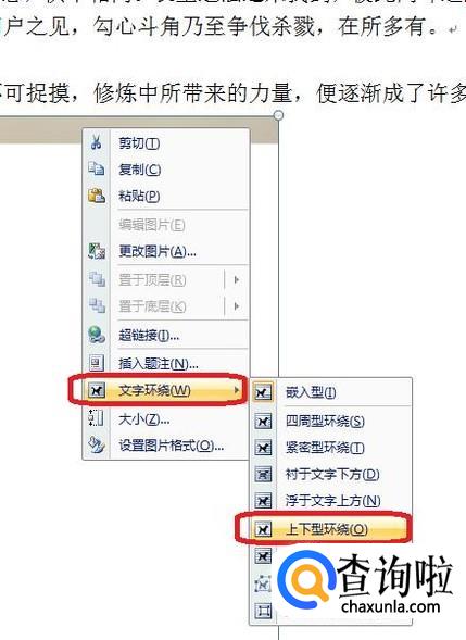 此时,我们可以右键点击图片,换一种文字环绕方式,比如“上下型环绕”(插入图片的时候一般默认都是“嵌入型”,容易出现图片显示不全的问题)。