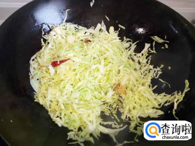 锅里放入油加热,油热后放入花椒,红干椒,葱姜,爆锅。随即放入卷心菜翻炒,放入少许料酒,少许酱油。