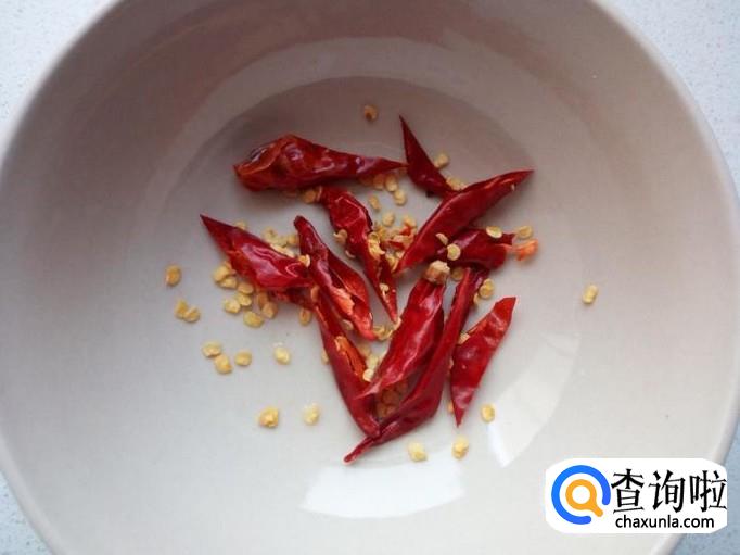 红干椒用水清洗干净,控干水分,斜刀切成段。切好葱,姜备用。