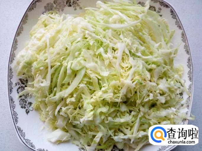 卷心菜用水清洗干净,控干水分,切成丝。