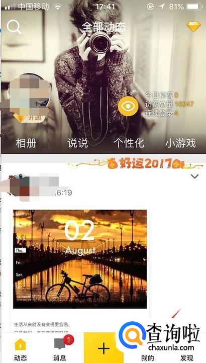 首先我们打开qq后进入到qq空间,点击下方状态拦到我的页面。