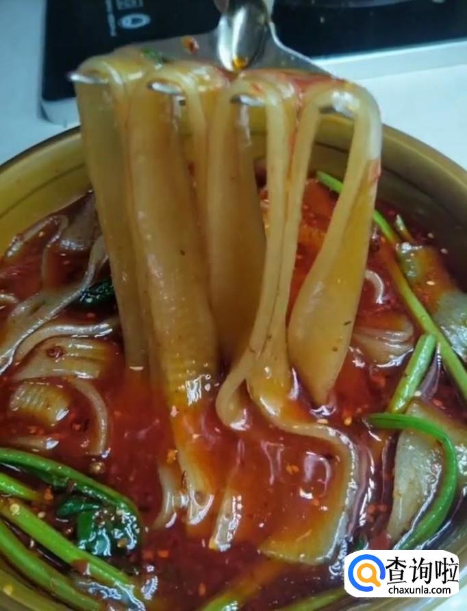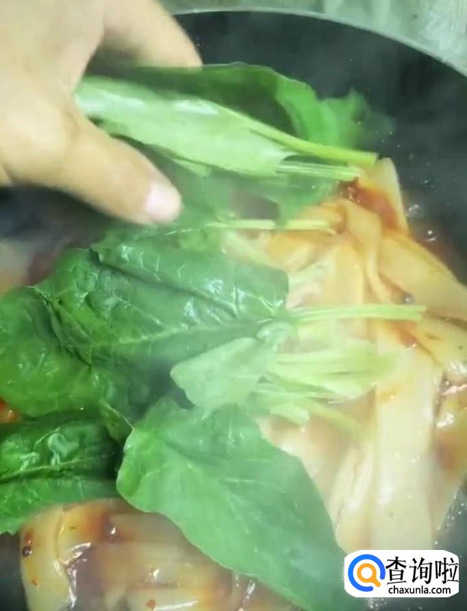 然后放入泡好的宽粉条,煮两分钟,再放入洗净的菠菜,开锅以后关火即可
