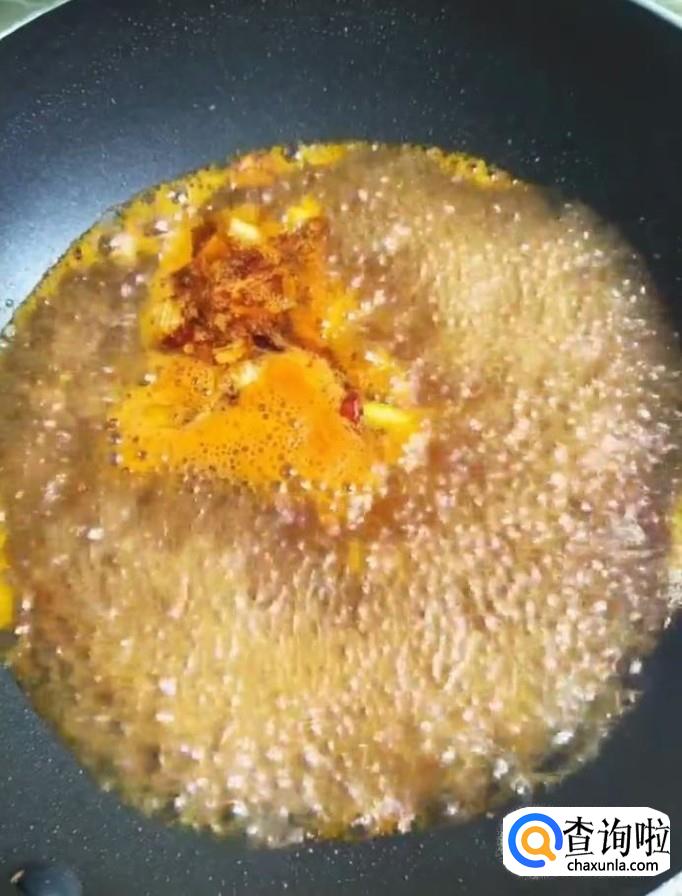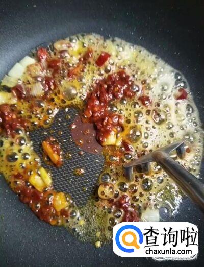首先,我们在锅中放入葱姜,干辣椒,花椒,郫县豆瓣酱,把红油炒出