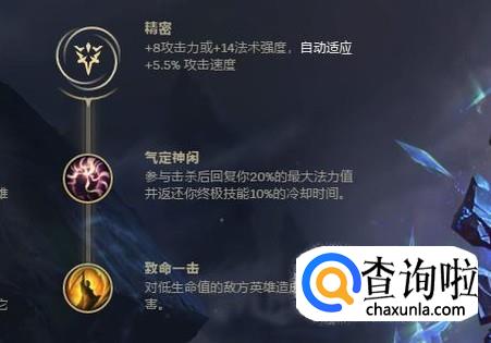 副系符文选择带精密系的气定神闲和致命一击,气定神闲配合上技能帽可以让拉克丝在团战中大招冷却极快,提供更多输出。致命一击增加对脆皮的斩杀能力。
