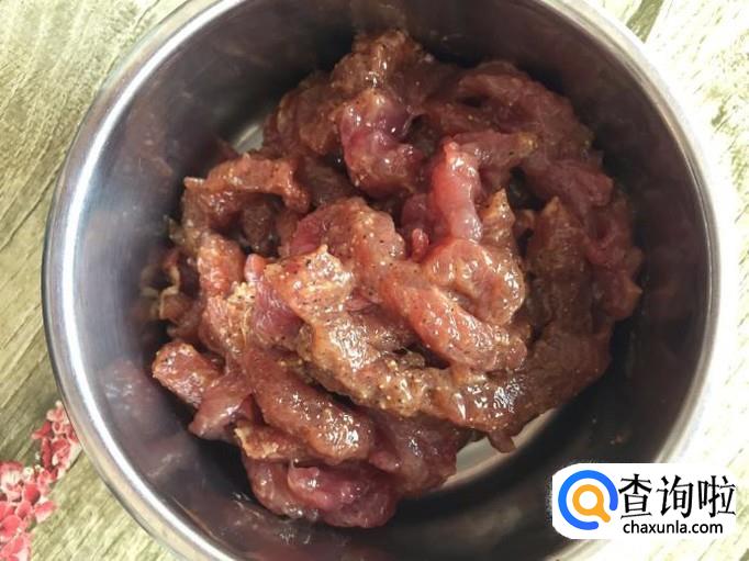 取一块牛肉,将牛肉洗净,切成丝状,加入适量的料酒、淀粉、黑胡椒粉,抓匀,腌制十五分钟;