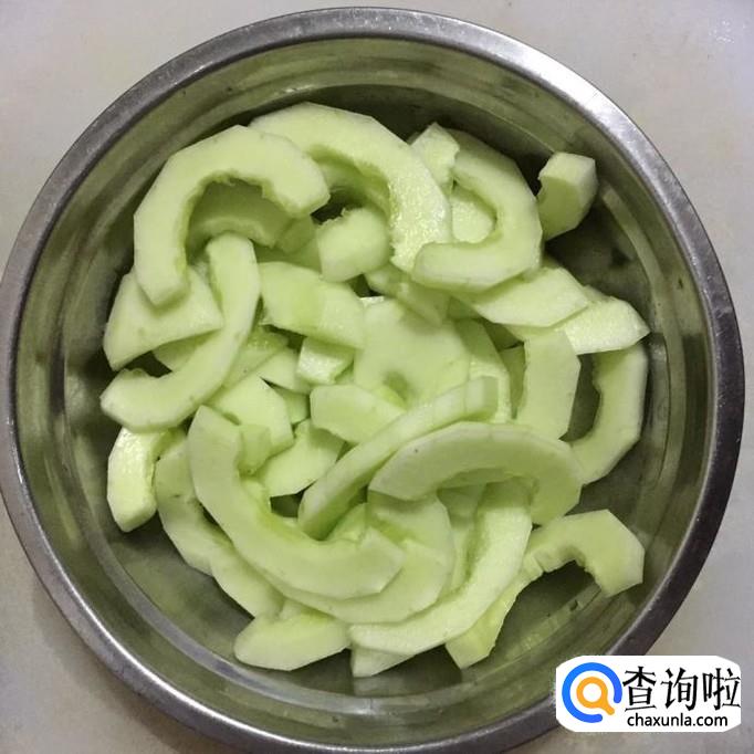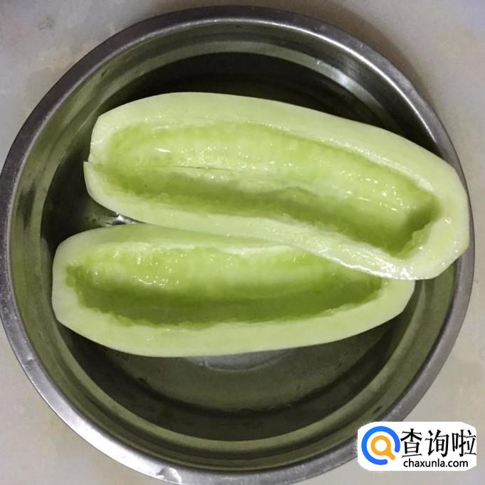 将秋黄瓜去皮,两头切掉一小段,再切成两半,去囊去籽洗净,再切成小块;