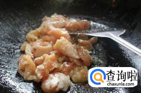 锅中加油适量,然后将油烧至7成热左右,加入鸡胸肉爆炒,1分钟后,舀起