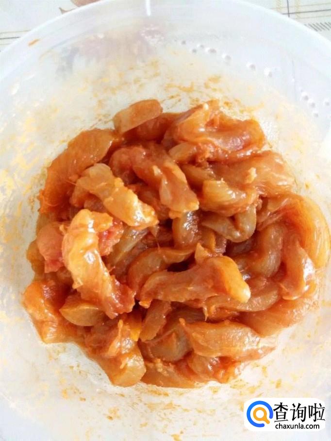 将鸡胸肉切成薄片,加鸡蛋一个,苕粉适量,盐,味精,花椒面,老抽适量,搅拌均匀