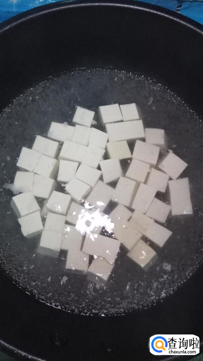 锅中烧开水,水开后放入适量盐,将豆腐放入锅中焯水,捞出备用。