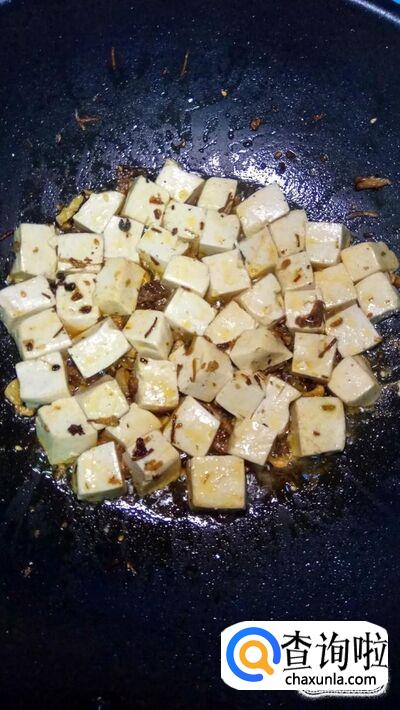 再放入适量香菇辣酱,搅拌均匀,然后将焯过水的豆腐放入锅中。