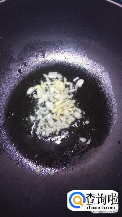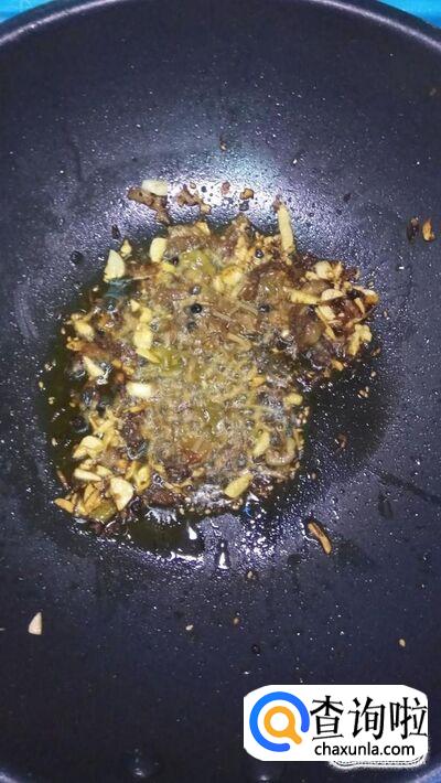 炒锅中放入适量油,油热后放入花椒和干辣椒爆香,然后将花椒和干辣椒捞出,扔掉不要,然后准备适量蒜和姜,切成碎末,倒入锅中炒香。