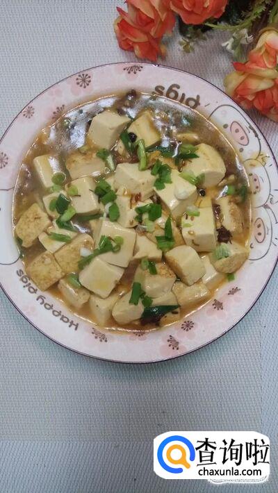 准备适量葱花切成葱花末,撒入锅中,美味的麻婆豆腐就做好了,盛入盘中,特别美味。