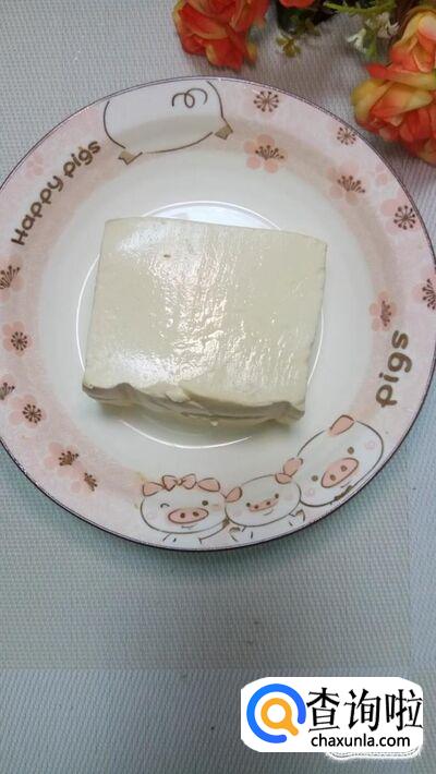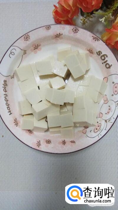准备一块嫩豆腐,洗净后,切成块,放入盘中备用。