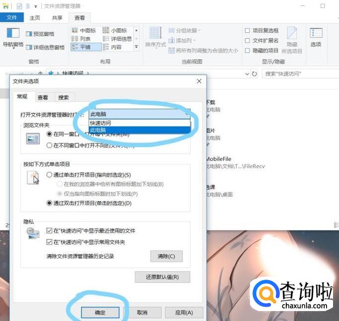 在出现窗口的“打开文件资源管理器时打开”选项中,选择“此电脑”。最后点击确定。