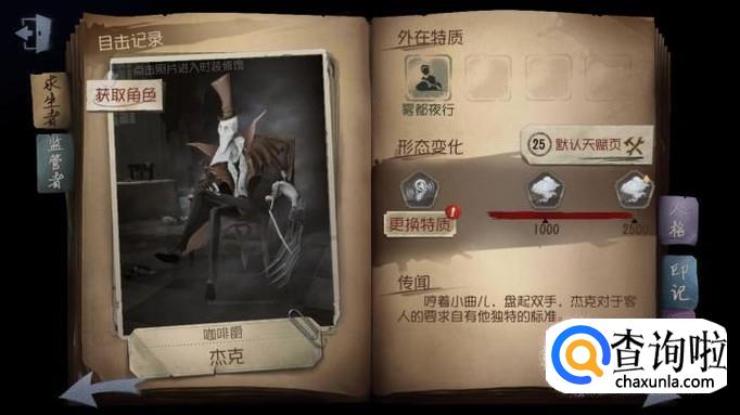 购买了玫瑰手杖之后,点击首页界面右下角的那本书,然后在监管者的界面找到杰克。