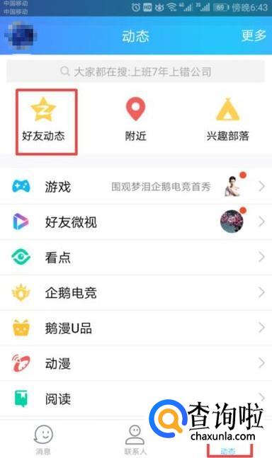 进入QQ后,我们点击右下角的动态,然后我们点击好友动态;