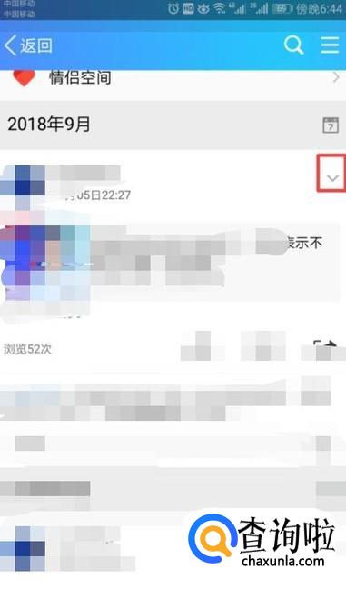 弹出的界面,我们进行下滑就可以看到我们的个人动态了,我们点击其中一条个人动态边上的那个下拉箭头;