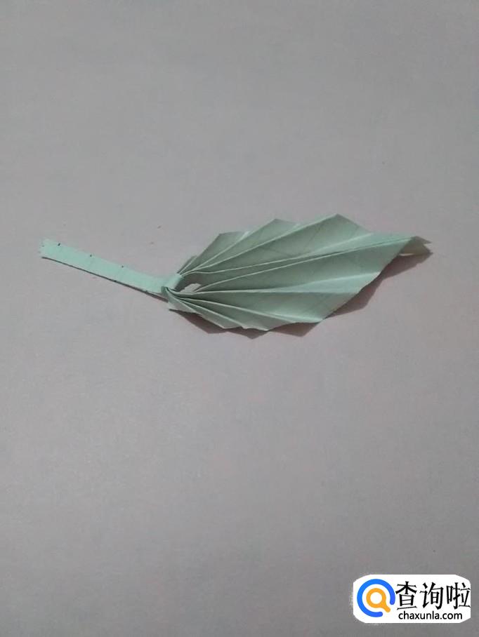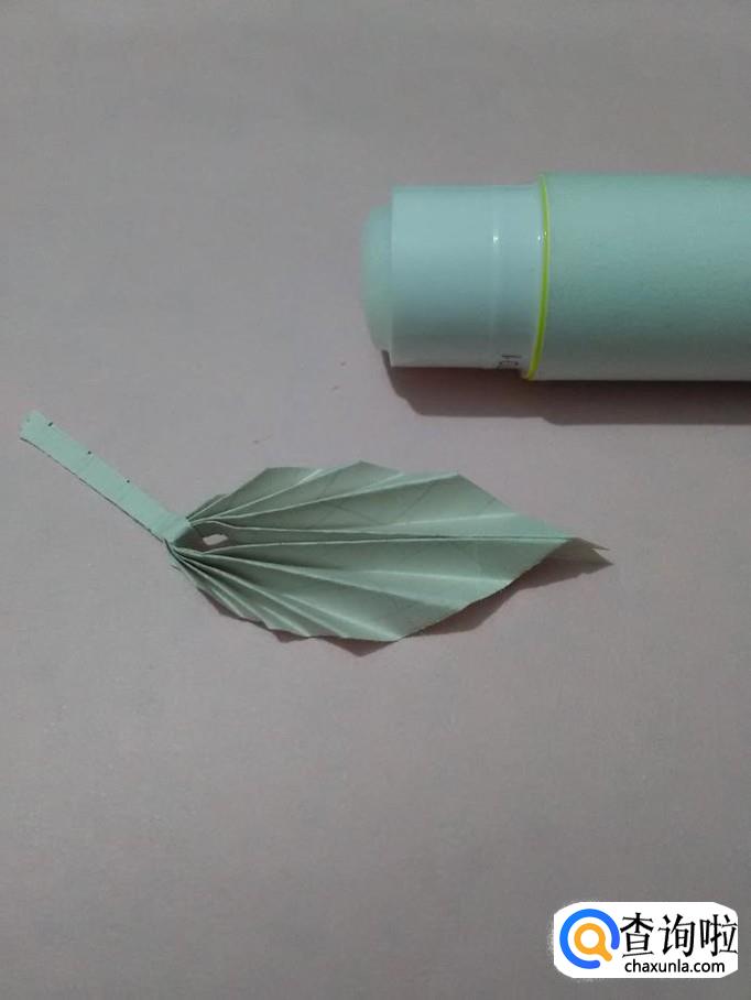 用胶棒把折好的三角形内侧粘在一起,当作叶子,再把小纸条的两边粘在一起,当作叶柄,一片精致的小树叶就折好了。